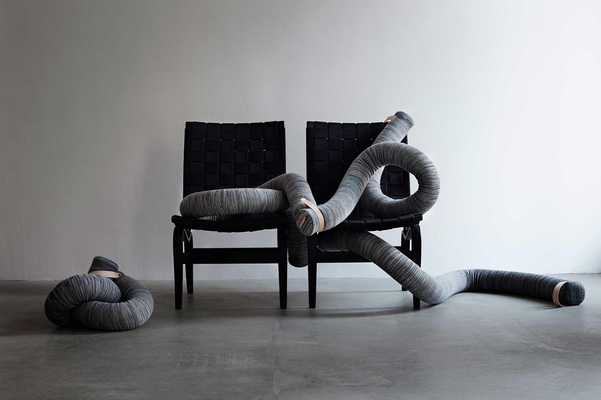 This soft sculpture is made with the harvest of the Wind Knitting Factory. A two meter long upholstered tube which can be knotted according to the user its needs.